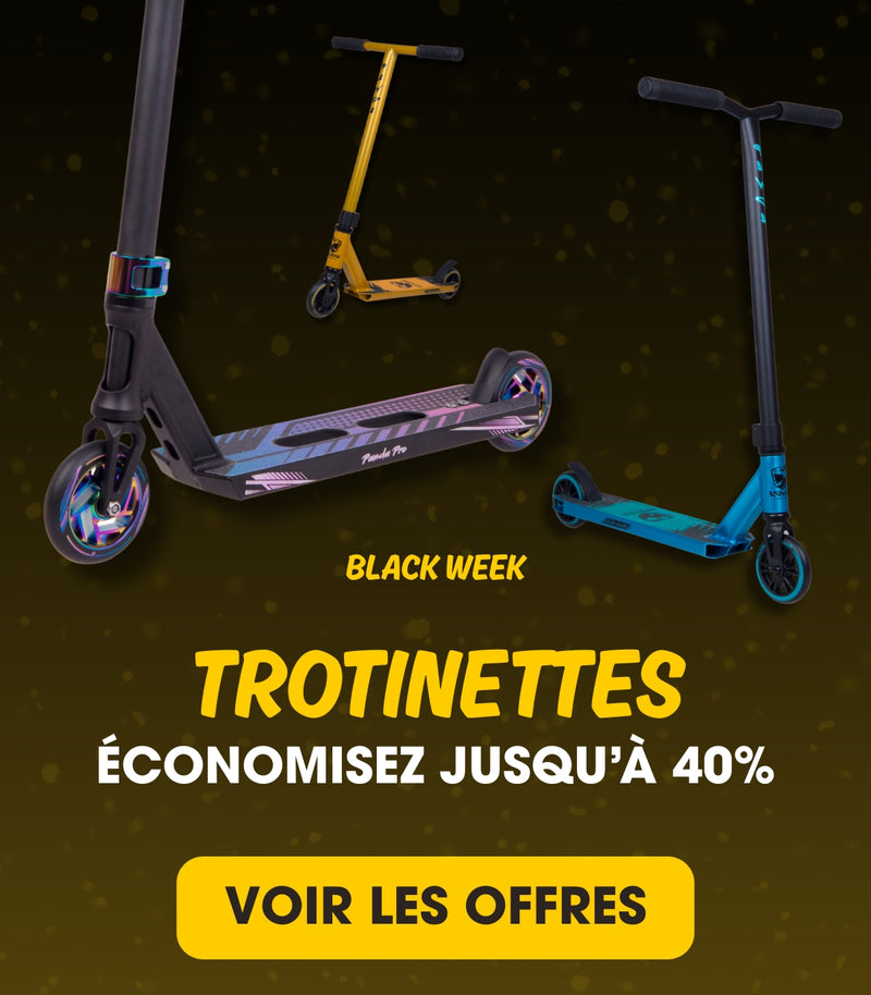 Profitez des meilleures offres de l'année sur les trottinettes, les pièces détachées, les protections, les rollers et les skateboards. Valable du 21 novembre au 1er décembre.